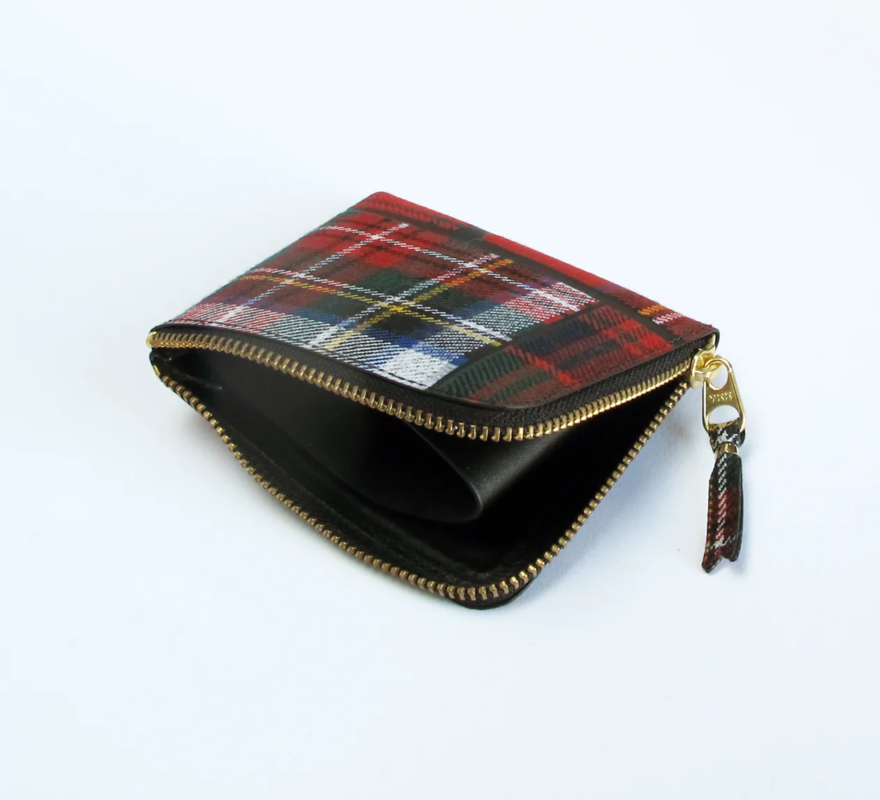 The Zip Wallet in red patchwork is a new fabric from Comme des Garçons. It opens across two sides featuring a black pocket in the centre for coins with room for cards and bank notes either side.